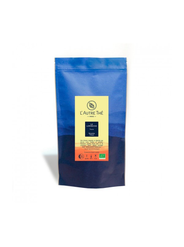 Composée de verveine et de tilleul, La Lumineuse est relevée de graines d'anis et de coriandre pour le côté végétal et de pétales d'oranger doux, qui lui offrent une facette à la fois fruitée et délicatement fleurie. Ce mélange agréablement équilibré, sans théine bien-sûr, est idéal pour se relaxer et bien digérer.